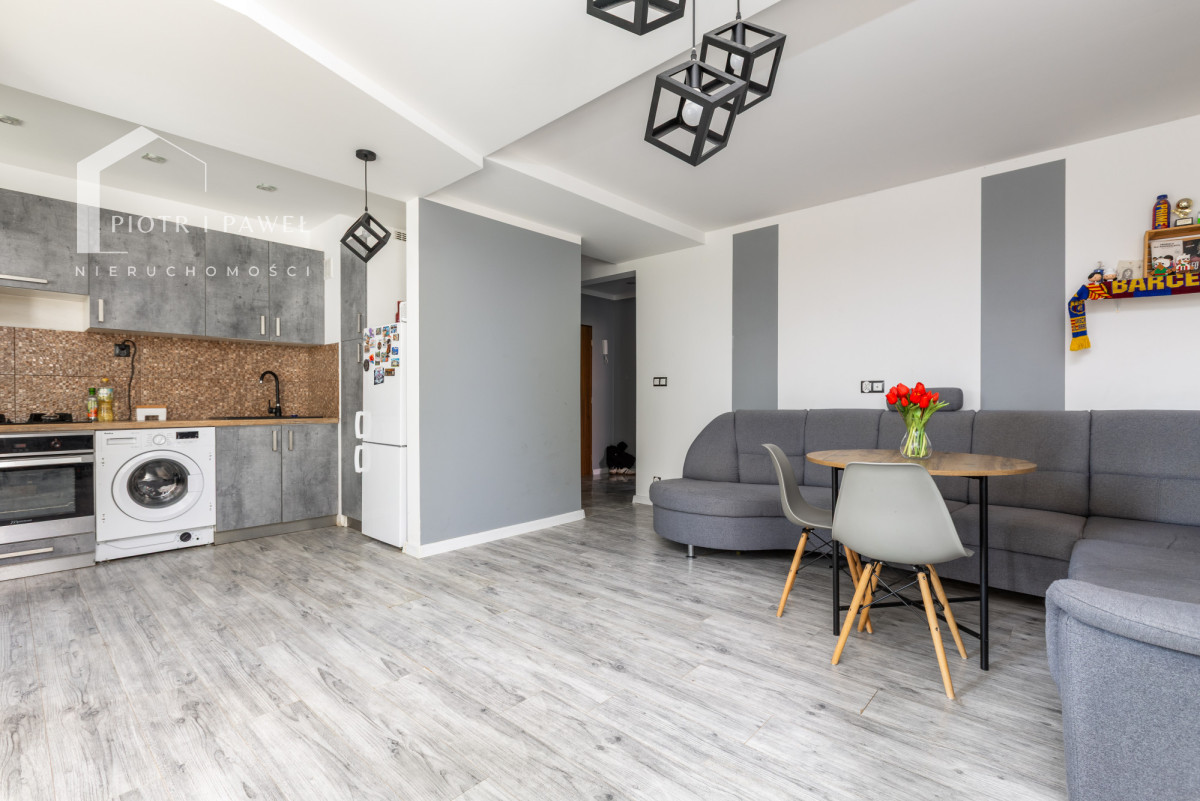 - przestronny salon z otwartą kuchnią i wyjściem na balkon - serce mieszkania, idealne do codziennego życia i spotkań