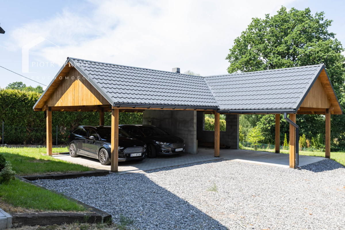 Na działce o powierzchni aż 16 arów znajduje się nowoczesna wiata o powierzchni 70 m², która pomieści dwa samochody, a jej druga część została zagospodarowana jako przyjemna strefa grillowa - idealna na letnie spotkania z rodziną i znajomymi.