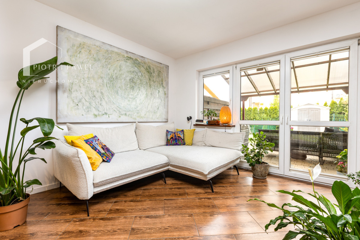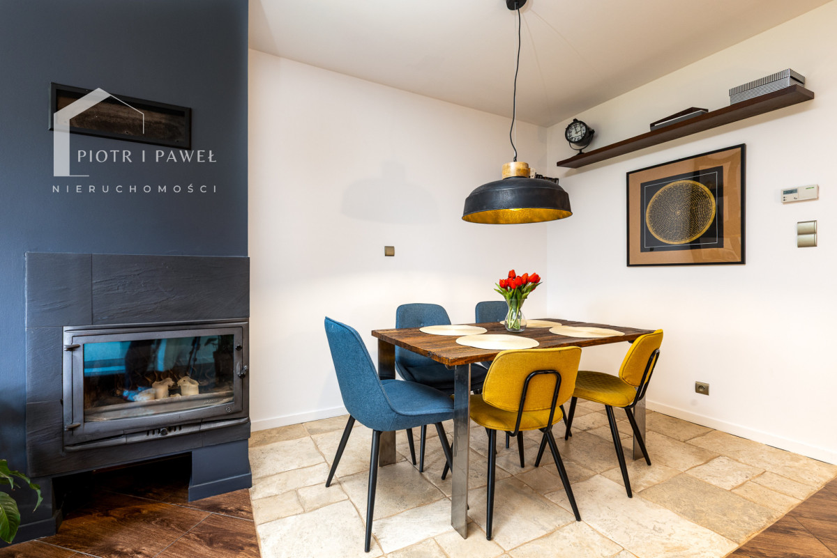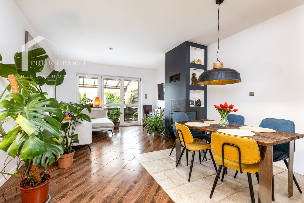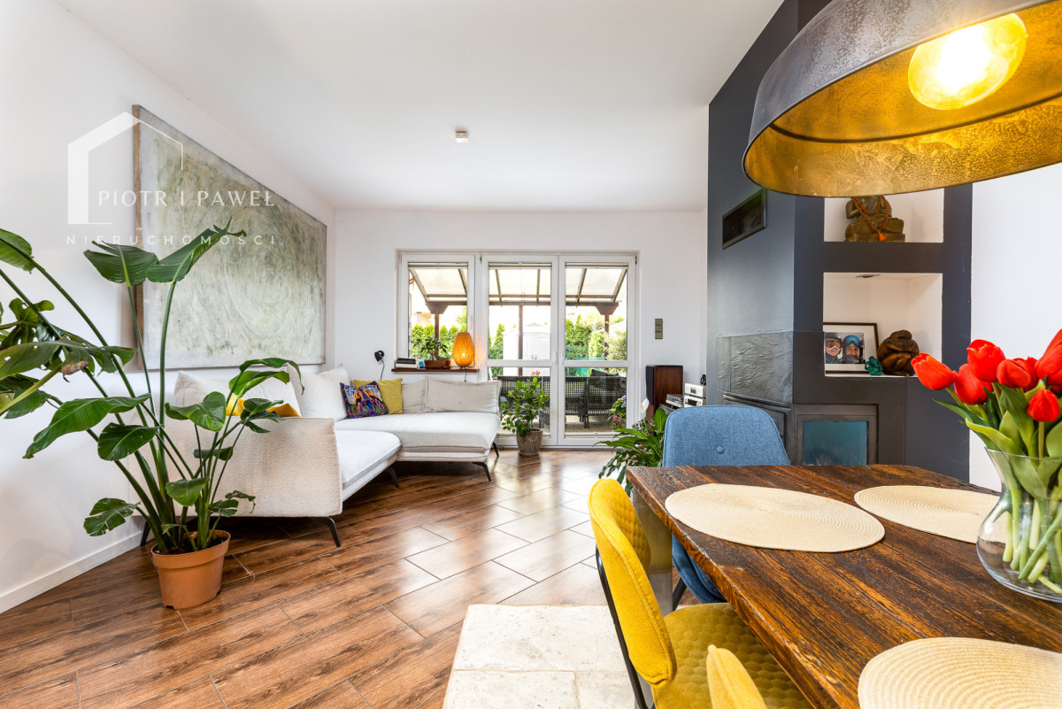 - Przestronny salon z kominkiem oraz wyjściem na zadaszony taras