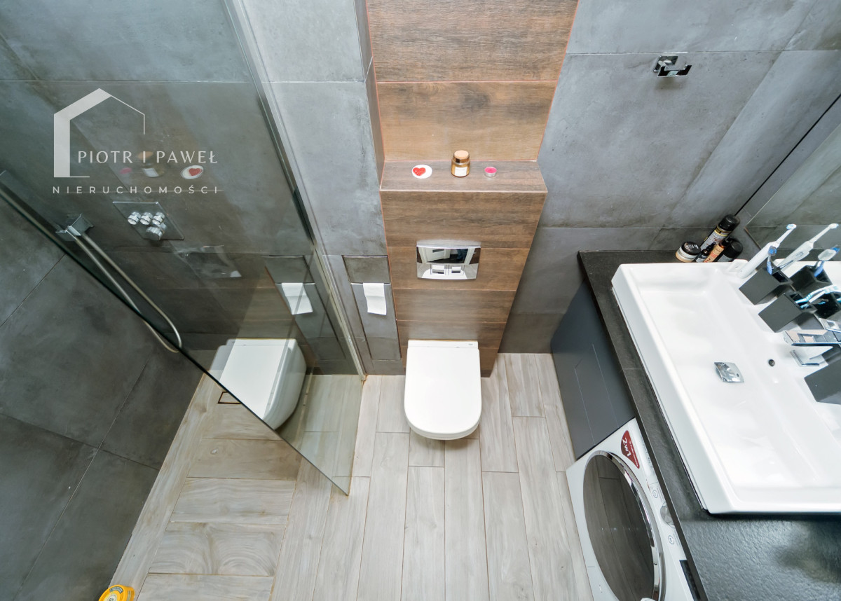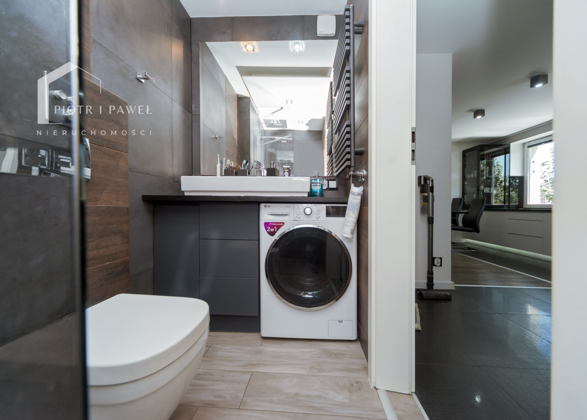 - łazienka z nowoczesną armaturą, prysznicem typu walk-in oraz pralkosuszarką