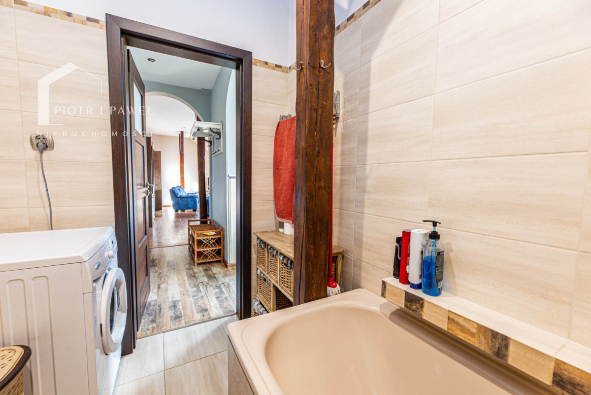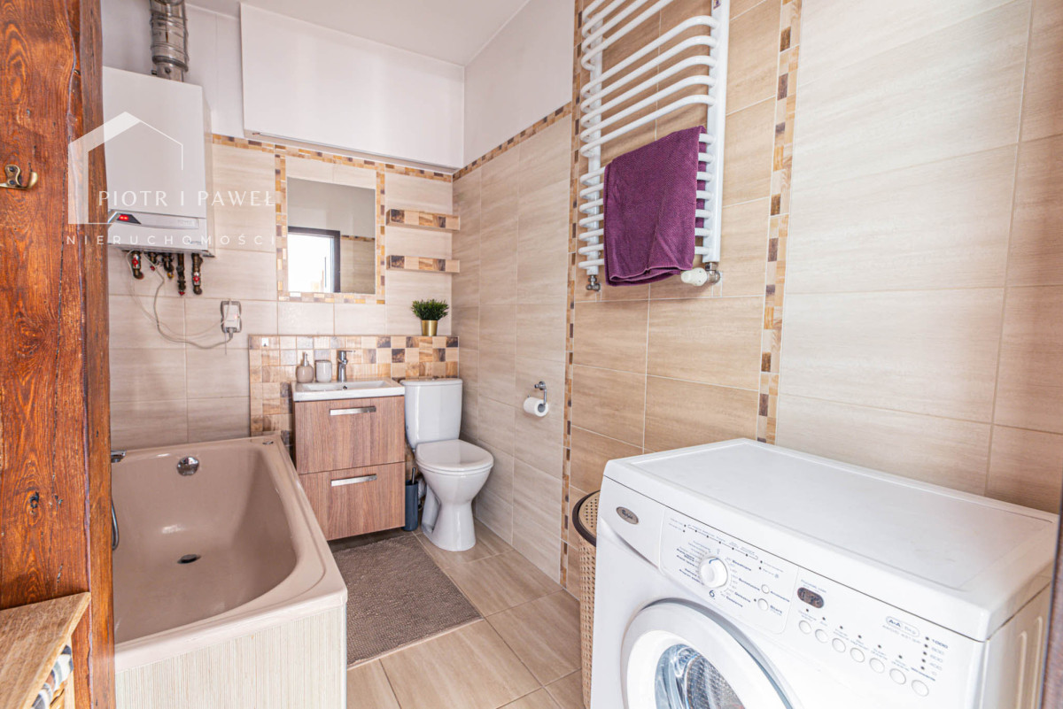 Estetyczne, widoczne na zdjęciach drewniane belki - w salonie, łazience i sypialniach - dodające wnętrzu przytulnego, rustykalnego charakteru.